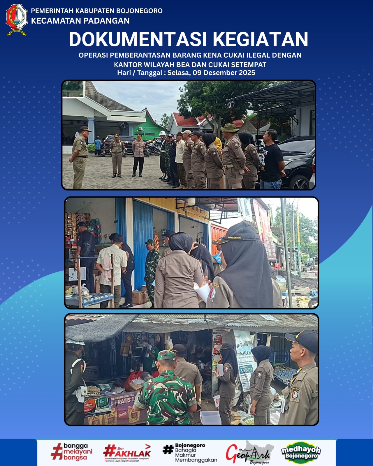 Laporan kegiatan Bidang Gakda pada hari Selasa, Tanggal 9 Desember 2025 Kegiatan Operasi Pemberantasan Barang Kena Cukai Ilegal bersama dengan kantor wilayah Bea dan Cukai setempat yang diinisiasi oleh Pemerintah Daerah Kabupaten Bojonegoro yang dilaksanakan di Kecamatan Padangan sebagai berikut :